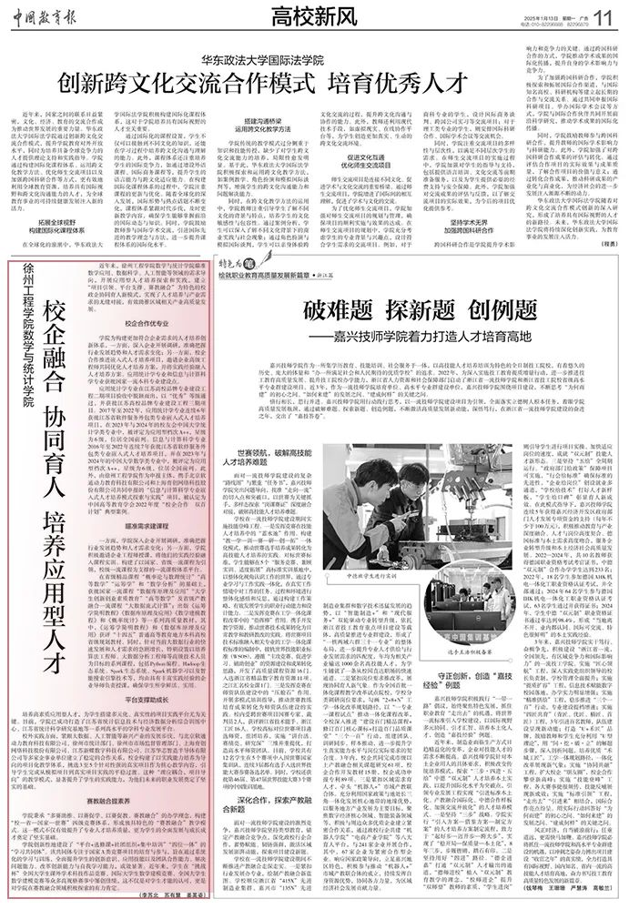 近日,《中国教育报》第11版以《校企融合 协同育人 培养应用型人才》为题,深度报道了6165金沙总站官方入口聚焦数学应用、数据科学、人工智能等领域的需求导向,积极开展应用型人才培养探索和实践,建立“项目引领、平台支撑、赛教融合”为特色的校政企协同育人新模式的创新举措和显著成效。